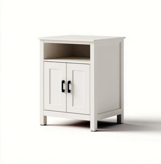 Table de Chevet Blanche en Bois de Pin avec Compartiment Ouvert et Double Porte de Rangement